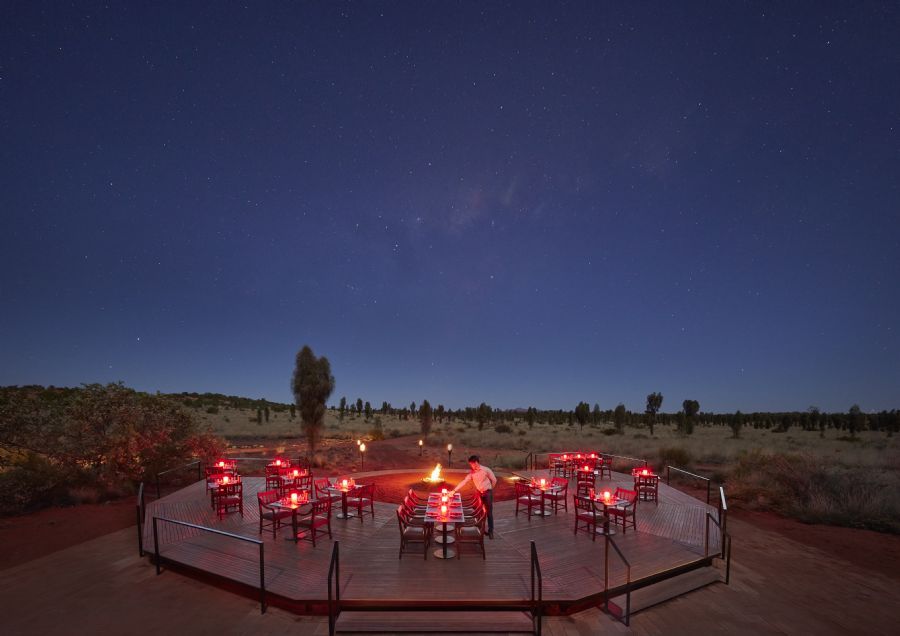 Table 131; Dine outdoors on fine fare celebrating a fusion of modern and indigenous flavors and discover the wonders of the southern night sky. As darkness falls, a four-course dinner with matched Australian wines is delivered with Longitude service. In the cool season, a warm fire sparks under the spectacular night sky. Indigenous performers mesmerize with the movement and songs of their ancient culture and after dinner, Longitude's resident astronomer regales guests with tales of the Southerly constellations. (Subject to weather conditions).