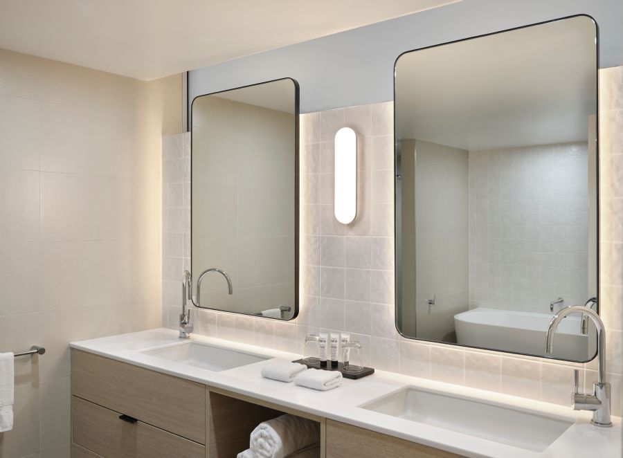 Each one-bedroom Terrace Suite at the Reef View Hotel Hamilton Island has a separate lounge and bedroom. The combined living and dining area stretches onto the open-air terrace, leading around for spectacular views from the bedroom’s king-size bed and chaise longue. Relax in the outdoor spa, or cook up some local seafood on the barbecue. The deluxe marble bathroom has a bath and separate shower, and the suite also has a guest bathroom. The two flat-screen TVs have pay-to-view first-run movies, and there’s in-room internet for sending I-can’t-believe-I’m-here emails.
