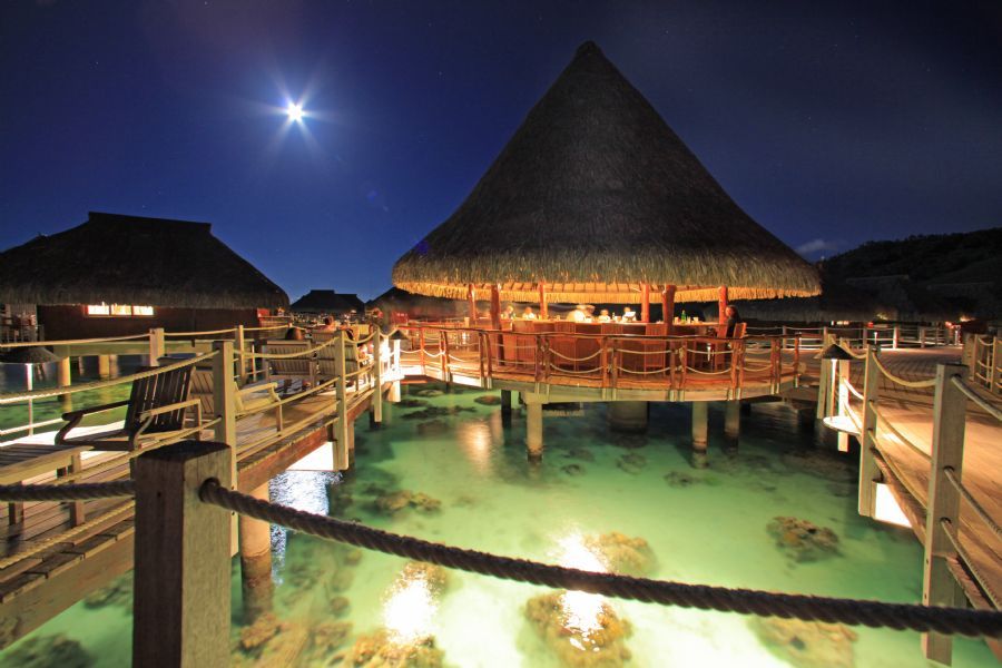 Relax in this contemporary 62m²/667sq.ft bungalow. Take in spectacular lagoon views or the majestic mountain views of Moorea. Luxuriate in the elegant marble bathroom with its rain shower and separate claw footed tub. Watch movies on the 37-inch flat screen TV, listen to your favorite music on the iPod station or surf the web with high-speed internet access (Wi-Fi). It also offers a private sun deck with lounge chairs and table and direct access to the lagoon. Enjoy the spectacular array of exotic marine life float past the glass floor-viewing panels.